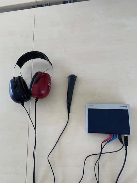 - pose du casque et lancement du dépistage automatique ou manuel, à chaque son émis le patient valide sa bonne réception à l’aide du bouton